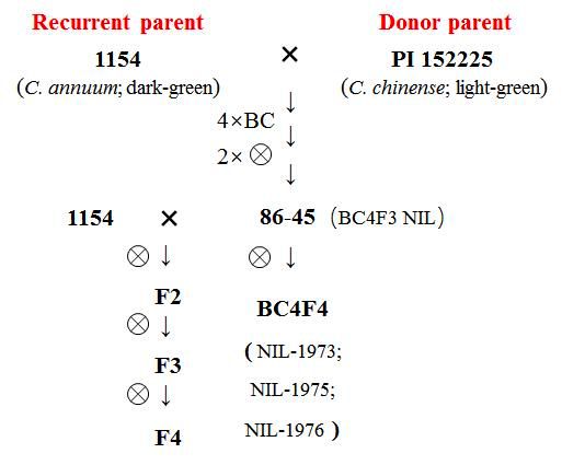 1. 群體構(gòu)建:1154(深綠;C. annuum),PI 152225(淡綠;C. chinense);86-45(BC4F3 NIL,含來(lái)自PI152225的pc1區(qū)段)(圖 1.及圖 2.)