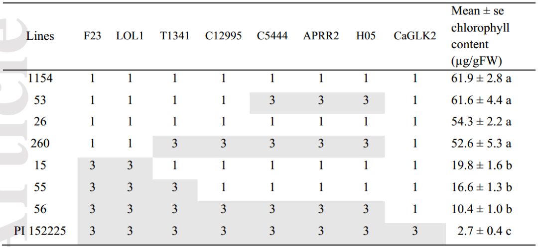 為進(jìn)一步精細(xì)定位pc1,本研究對(duì)624個(gè)F2(1154 × NIL 86-45)單株標(biāo)記分型以篩選QTL區(qū)域內(nèi)的交換單株?;谇捌谘芯?,標(biāo)記T1341與QTL peak連鎖最為緊密 (Brand et al., 2012),作者又在T1341附近開(kāi)發(fā)出6個(gè)標(biāo)記,在標(biāo)記F23與H05間,共篩選出34個(gè)F4交換單株,可代表6種基因型組合,橫跨Chr.1:5cM的區(qū)間。為排除pc1與pc10互作的影響,作者將所有交換單株的CaGLK2固定為1154等位基因。結(jié)果分析暗示,F(xiàn)23與LOL1是與QTL連鎖最為緊密的標(biāo)記,因?yàn)閘ine 15含PI 152225最短的導(dǎo)入片段且葉綠素含量顯著低于1154,而line 260在這2個(gè)標(biāo)記間含1154等位且與1154葉綠素含量沒(méi)有顯著性差異。此外,lines 53與260在APRR2-like位點(diǎn)含有PI 152225等位,葉綠素含量卻與1154沒(méi)有顯著差異,暗示此基因(APRR2)在本研究中的遺傳背景下不影響葉綠素含量(表1.)。