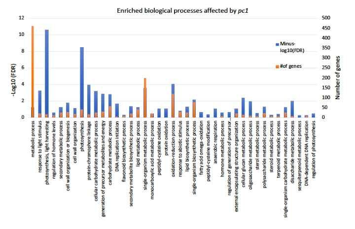 為研究pc1參與影響的細(xì)胞學(xué)過(guò)程,本研究對(duì)混池間983個(gè)差異表達(dá)基因進(jìn)行GO富集分析并根據(jù)生物過(guò)程進(jìn)行分類(圖5)。最顯著的GO term過(guò)程與光合作用及氧化還原有關(guān),這兩個(gè)過(guò)程包含184個(gè)DEGs,被分成17個(gè)亞類,其中最大的一類是氧化還原過(guò)程。這一類基因與葉綠素合成下調(diào)有關(guān),例如,POR,CAO與HEMA1,還與葉綠素降解基因上調(diào)有關(guān),例如,CA00g73130,暗示葉綠素合成與降解受這個(gè)QTL調(diào)控。另一類重要基因,包含Chlorophyll a/b-結(jié)合蛋白的多個(gè)成員基因(CA01g17090,CA02g12050,CA02g12060,CA02g12070等),在淡綠混池中下調(diào)表達(dá),它們參與光合、蛋白發(fā)色團(tuán)及光刺激響應(yīng)等過(guò)程。另外,若干與碳固定有關(guān)的Rbc家族基因在淡綠混池中也呈現(xiàn)下調(diào)表達(dá)。