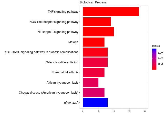這個(gè)圖與一般的函數(shù)barplot畫(huà)出來(lái)的不一樣的地方在于它的顏色,這張圖里面的顏色反應(yīng)的是fdr的大小,是一個(gè)連續(xù)值,ggplot2可以將連續(xù)值映射到到顏色上,橫坐標(biāo)是通路中感興趣基因的個(gè)數(shù)。