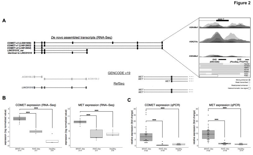 為了探索PTC中BRAF和RAS樣特異性lncRNA模式,首先在最近發(fā)表的來自22個甲狀腺活組織的RNA-Seq數(shù)據(jù)集中建立了從頭轉(zhuǎn)錄組裝的計算工作流程,定義一個新的PTC模型轉(zhuǎn)錄組。大于200nt低編碼潛能且與已注釋基因位點無重疊的轉(zhuǎn)錄本鑒定出454個新的lncRNA。與蛋白質(zhì)編碼基因類似,已知和新發(fā)現(xiàn)的lncRNA在患者和對照之間具有顯著差異的表達水平(FDR <0.05)。202個lncRNAs的表達在BRAF和RAS樣PTC之間存在顯著差異(其中77個在BRAF樣PTC中過表達,125個低表達),其中60個未在公共數(shù)據(jù)庫中注釋(圖1D和1E;FDR <0.05)。因此,為鑒定尚未注釋的lncRNAs :i)在PTC中異常表達,ii)在BRAF-和RAS樣亞組之間差異表達,iii)在附近定位和iv)與已知癌癥驅(qū)動基因高度相關(guān),作者使用“最近轉(zhuǎn)錄起始位點”(TSS)方法選擇mRNAs / lncRNAs對。有趣的是,基于這些標準,將COMET(COrrelated-to-MET)鑒定為新的lncRNA,與MET癌基因正相關(guān)(r = 0.7)。