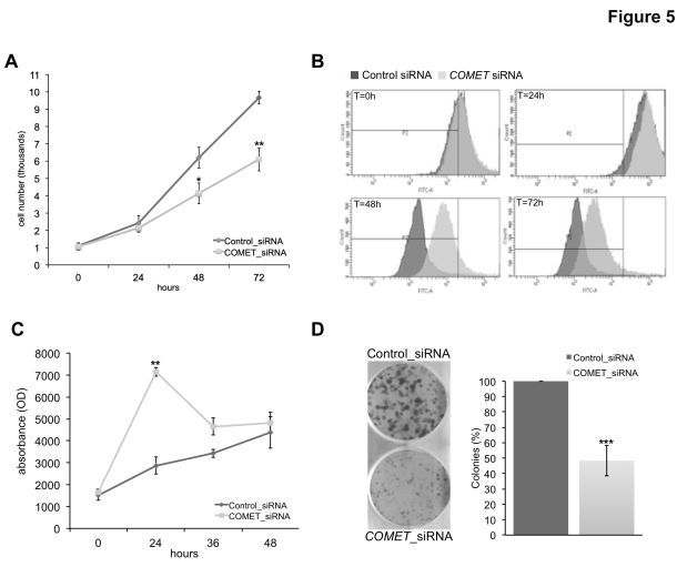 由于COMET KD引起c-Met水平的相關(guān)下降,以及甲狀腺癌細胞中其他MAPK相關(guān)癌基因表達水平的顯著降低,進一步研究了COMET KD對腫瘤細胞的表型效應(yīng)。為此在不同時間點測量了COMET KD后TPC-1細胞系的細胞活力和增殖能力。有趣的是,與對照無關(guān)轉(zhuǎn)染的細胞相比,COMET-KD活細胞的百分比顯著降低至~40%(在72小時)(圖5A)。通過細胞增殖測定檢測COMET-KD顯著降低細胞增殖(圖5B)。此外,為了進一步了解COMET如何調(diào)節(jié)甲狀腺癌細胞的細胞生長,通過測量半胱天冬酶3和7的活性驗證了COMET KD是否能夠誘導(dǎo)細胞凋亡。如圖5C所示,沉默24小時后COMET KD顯著增加凋亡TPC的數(shù)量 。最后,為了驗證COMET KD是否在體外影響甲狀腺腫瘤細胞的致瘤潛力,檢測了COMET-KD TPC-1和對照細胞的克隆形成能力。如圖5D所示,在菌落的數(shù)量和大小方面,COMET沉默顯著影響甲狀腺癌細胞的致癌能力。