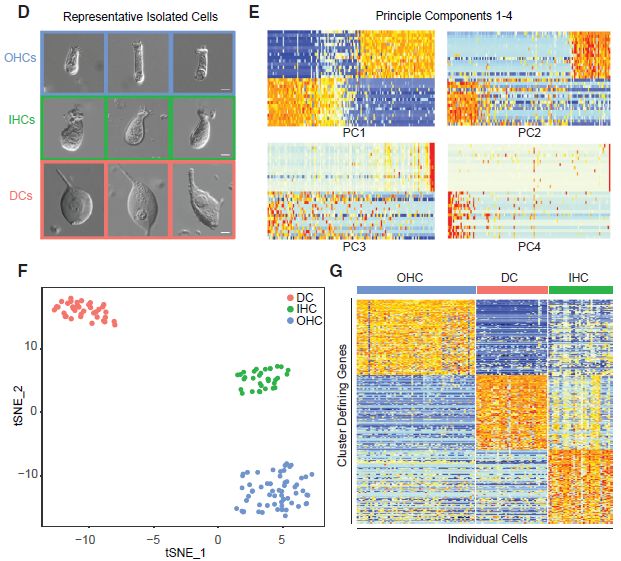 使用Seurat進(jìn)行基于主成分1和2的無(wú)偏差聚類(圖1E)。得到的tSNE?clusters顯示IHC、OHC和DC分離明顯,形成與其形態(tài)學(xué)分組一致的無(wú)偏細(xì)胞特異性組(圖1F)。為了鑒定每種細(xì)胞類型的特征性表達(dá)模式,在AUC分類器下為每種細(xì)胞類型提取了前100個(gè)cluster定義基因(圖1G)。
