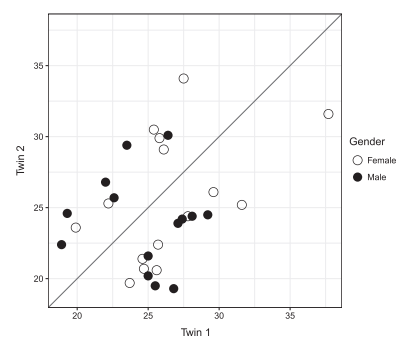 表1展示了樣本相關(guān)人體測量和生化變量的結(jié)果。最后一列是每個變量的對內(nèi)相關(guān)性。大多數(shù)變量具有相當(dāng)高的和/或顯著相關(guān)性,一些顯示低或不顯著的對內(nèi)相關(guān)性(例如GLU,TG)。下圖顯示了每對雙胞胎的BMI測量值。所有雙胞胎都與對角線保持距離,表明BMI測量中的對內(nèi)不一致。同時,圖中的總體模式還表明如表1中報告的BMI的弱配對內(nèi)相關(guān)性(r = 0.307,p = 0.099)。在男性(實點)和女性(空點)雙胞胎中沒有觀察到BMI不一致的性別特異性模式。