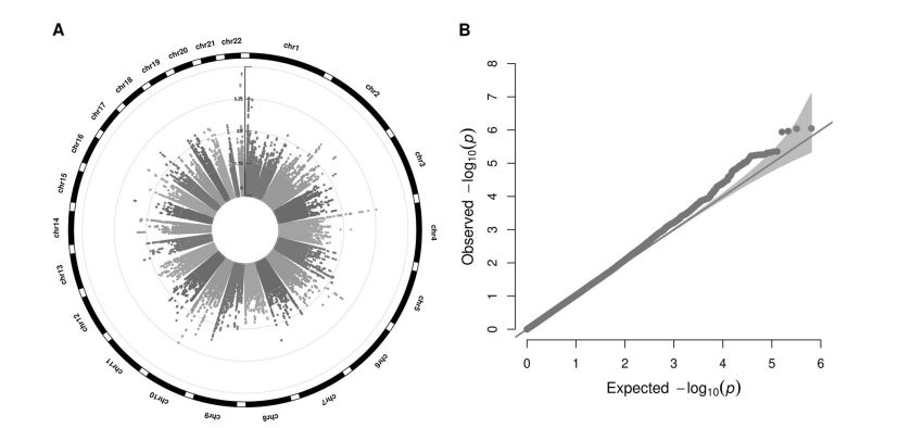 基于單個位點的EWAS分析,鑒定出136個CpG(p <1e-04),其中30個CpG(p <1e-05),2個CpG(p <1e-06)。 沒有位點達(dá)到全基因組顯著性(定義為FDR <0.05),最低FDR = 0.195。 圖中顯示了每個CpG位點的p值與其染色體位置的曼哈頓圖(圖a)和針對隨機預(yù)期p值分布繪制的預(yù)估p值的Q-Q圖(圖b)。最顯著CpG?p值表明與隨機分布的偏差及其陰影區(qū)域的95%置信區(qū)間(圖b),說明這些CpG與BMI的非隨機關(guān)聯(lián)。