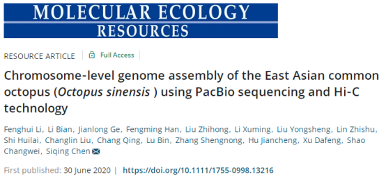近日,中國水產(chǎn)科學(xué)研究院黃海水產(chǎn)研究所陳四清研究員團隊與北京百邁客生物科技有限公司合作完成了中國真蛸(Octopus sinensis)染色體水平基因組,相關(guān)研究成果發(fā)表在知名期刊Molecular Ecology Resources上。該研究是陳四清研究員團隊繼今年5月發(fā)表超高質(zhì)量綠鰭馬面鲀基因組后在水生生物基礎(chǔ)研究領(lǐng)域取得的又一項重要研究成果。