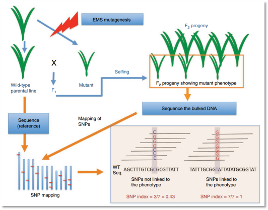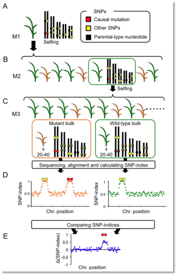 (1)該文章是對突變性狀定位的一種延伸,也是對mutmap方法的一個補充,主要區(qū)別是如果隱形突變個體無法正常發(fā)育在幼苗期出現死亡,因此無法與野生親本雜交構建分離群體,所以該方法巧妙的選擇了突變位點雜合的個體進行自交,從而在自交M3或者M4選擇極端個體構建混池進行后續(xù)分析。