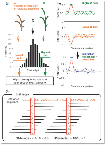 BSA(bulked segregant analysis)又叫集群分離分析法,該方法主要是選擇雙親群體分離后代中具有極端表型的個體進行混樣,通過比較不同極端混樣池之間的多態(tài)性標記的差異,從而篩選出與性狀相關的分子標記,實現目標基因的定位。BSA分析早期使用的都是傳統(tǒng)分子標記,根據標記與性狀共分離(緊密連鎖)得到定位區(qū)間,不過由于其標記密度低、定位精度差、實驗操作繁瑣已經逐漸不再使用。近年來,BSA方法和高通量測序相結合,通過比較不同混池間SNP的頻率差異或者比較混池間純合SNP的密度的差異,實現基因的定位,高通量測序方式以其簡單、快速、準確、高性價比的特點受到科研工作者的青睞。那么,對于不了解BSA的研究者來說,如何快速了解BSA的發(fā)展歷程、原理方法、應用領域,如何快速上手BSA分析,今天大師兄為大家推薦幾篇BSA代表性文章,讓你輕松搞定BSA,趕緊上車。
