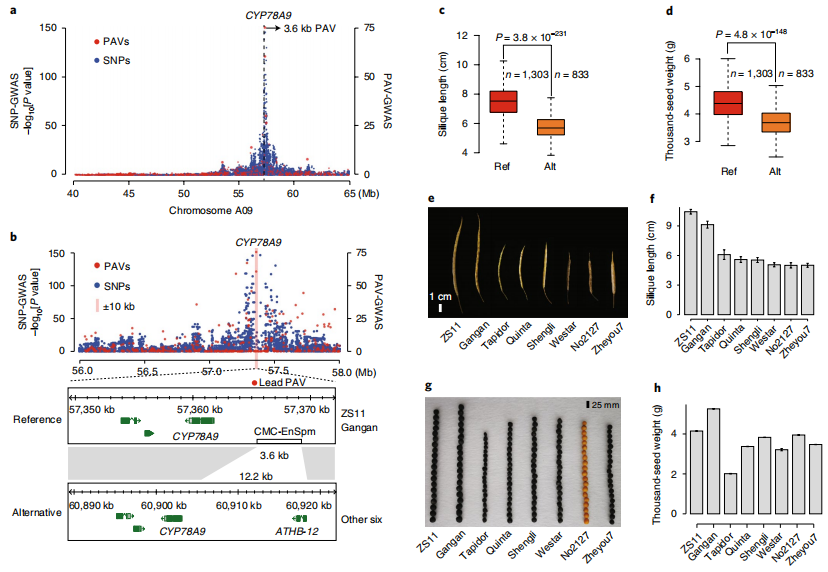 泛基因組可以結合GWAS數據,有效提高GWAS 的準確性,捕獲到更加完整的遺傳變異信息。通常,GWAS分析是將個體材料與參考基因組進行比對,然后將得到的 SNP 與表型進行關聯分析,當GWAS 分析參考基因組不存在的功能基因引起的表型時,會出現 GWAS 定位區(qū)間與實際功能基因之間較大偏差甚至檢測不到的情況。但以泛基因組為參考基因組,把結構變異作為基因型數據用于 GWAS 分析,可以有效解決這類因單一參考基因組而導致的信息不全問題。例如,油菜以泛基因組鑒定到的 PAV 為基因型進行GWAS 分析,直接鑒定到基因BnaA9.CYP78A9啟動子區(qū)存在一段 3.9 kb 的插入,該變異嚴重影響油菜的角果長和粒重[2]。結構變異相關的GWAS研究更具有新意,也是后續(xù)研究的熱點。