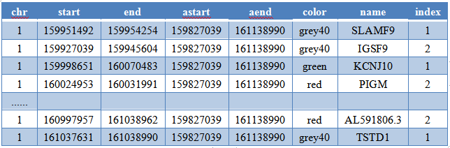 首先用你能用的辦法將目標(biāo)區(qū)域(1:160000000-161000000)內(nèi)的基因、目標(biāo)區(qū)域上游的兩個(gè)基因、目標(biāo)區(qū)域下游的一個(gè)基因的位置都提取出來(lái),然后為每個(gè)基因賦一個(gè)顏色。中間灰色的bar兩端的突出可以從第一個(gè)基因的開始位置向上游擴(kuò)100K、最后一個(gè)基因的結(jié)束位置向下游擴(kuò)100K。整理成作圖用的輸入文件,如下: