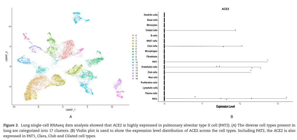 由于ACE2、AGT和PPARA在PAT2細(xì)胞中顯著表達(dá),因此PAT2細(xì)胞可作為肺組織的潛在的與新冠病毒感染的細(xì)胞。ACE2表達(dá)水平的表達(dá)圖提示肺對(duì)病毒血癥具有高度的易感性。然而,該研究也鑒定了兩種不同的細(xì)胞,即漿細(xì)胞和肥大細(xì)胞。在漿細(xì)胞中,三種轉(zhuǎn)錄均顯著表達(dá),而在肥大細(xì)胞中,AGT和ACE2顯著表達(dá)。
