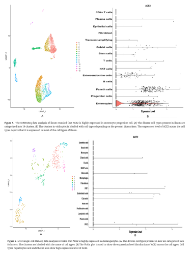 回腸和肝臟是代謝系統(tǒng)的一個(gè)區(qū)域,兩個(gè)器官都有ACE2陽性的上皮樣細(xì)胞。在回腸中,腸上皮細(xì)胞和纖毛上皮細(xì)胞有顯著表達(dá)ACE2, AGT和PPARA(Figure 5),但是,F(xiàn)igure 6中顯示相對(duì)于其他器官,這些細(xì)胞表達(dá)水平相對(duì)較低。類似地,膽管細(xì)胞是主要存在于肝組織中的一種上皮細(xì)胞。在這些細(xì)胞類型中,ACE2、AGT和PPARA標(biāo)記物的表達(dá)值較高。