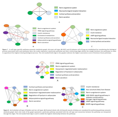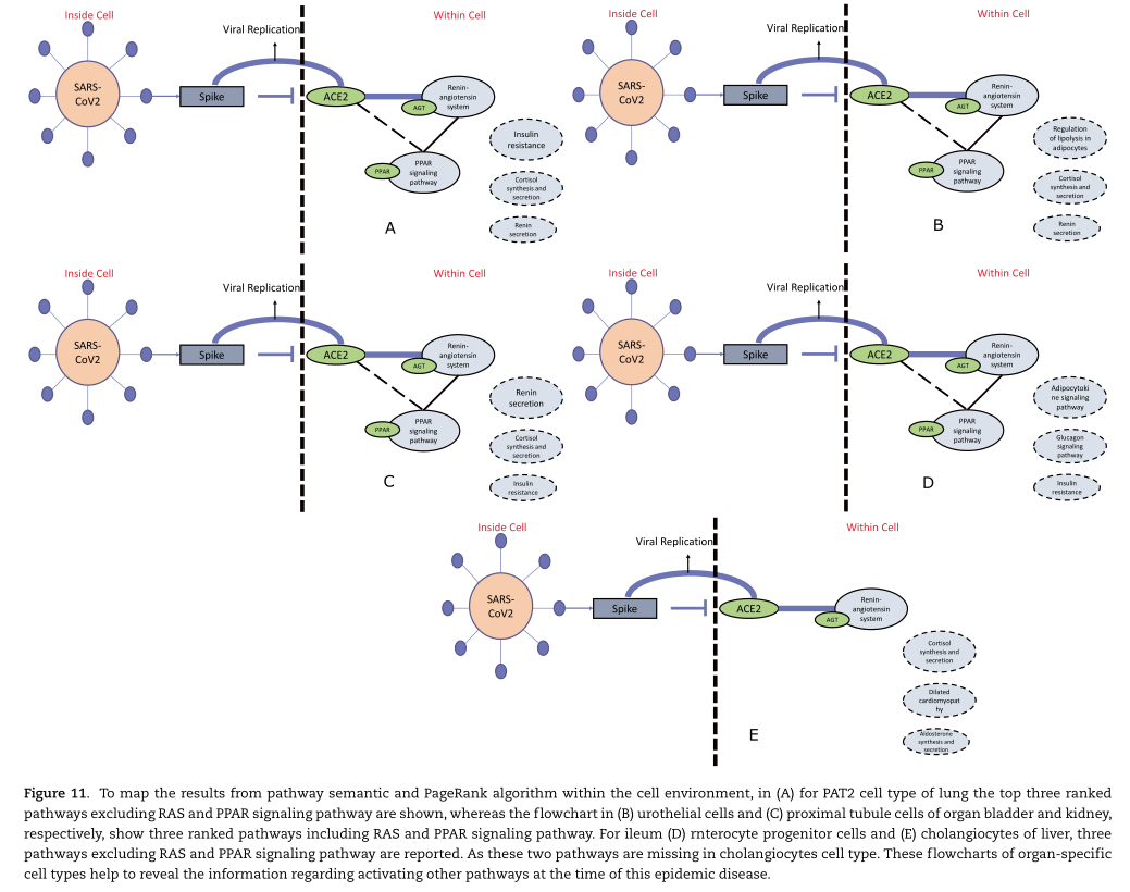 在單個(gè)細(xì)胞類型中,受影響的細(xì)胞和通路調(diào)節(jié)之間的關(guān)系如Figure 11所示。只顯示了每個(gè)器官中高度表達(dá)ACE2的細(xì)胞類型。從圖中可以看出,PPAR信號(hào)通路和RAS是感染后的主要通路。這種細(xì)胞類型特異性的研究發(fā)現(xiàn)一些途徑在肺中是共同的,但影響率是不同的,對(duì)膀胱和腎臟也類似。