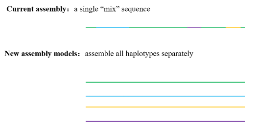 同源多倍體是指所有染色體組來源于一個個體的染色體組自我復(fù)制或同一個物種內(nèi)不同個體間的雜交與多倍化。通常二倍體基因組裝出單套基因組,異源四倍體能組裝出兩套基因組。而由于早期的技術(shù)限制,同源多倍體物種往往只能組裝1-2套(例如2017年甘薯基因組)。隨著技術(shù)的發(fā)展以及研究的深入,研究者發(fā)現(xiàn)僅單套的基因組數(shù)據(jù)難以完全演示該物種的全面信息。尤其是一些同源多倍體的物種,同源染色體之間不同遺傳位點的組合對生物表型有重要影響,如動植物中的雜種優(yōu)勢、某些物種雜交不育現(xiàn)象等。單倍型等位基因間差異對基因表達(dá)、功能及其表型都有著重要影響,大多數(shù)雜交品種的優(yōu)勢表型都受等位基因調(diào)控。