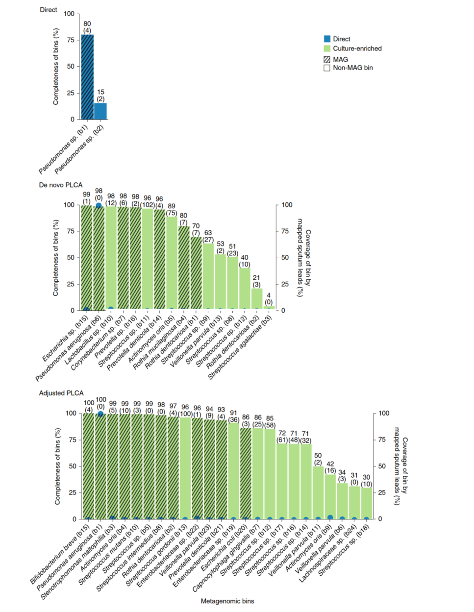 作者將擴(kuò)增子測(cè)序與富集培養(yǎng)宏基因組測(cè)序相結(jié)合研究人類(lèi)微生物群落。以肺囊性纖維化為例,平均培養(yǎng)了82.13%的可操作分類(lèi)單元(OTUs),占痰液樣本直接測(cè)序所鑒定的相對(duì)豐度的99.3%,更重要的是,與直接測(cè)序相比,富集培養(yǎng)方法鑒定的OTUs多了63.3%。作者開(kāi)發(fā)了平板覆蓋算法(PLCA),以確定富集培養(yǎng)平板的代表性子集,從而在該子集上進(jìn)行宏基因組研究。與不依賴(lài)培養(yǎng)的方法相比,可以恢復(fù)更多的物種多樣性(包含更好的低豐度物種的組裝基因組,MAGs),更長(zhǎng)的重疊群和更好的功能注釋結(jié)果。PLCA算法也可以應(yīng)用于此前發(fā)布的腸道菌群數(shù)據(jù)集,富集培養(yǎng)分子圖譜可以更好的了解微生物菌群在人類(lèi)健康和疾病中的作用。
