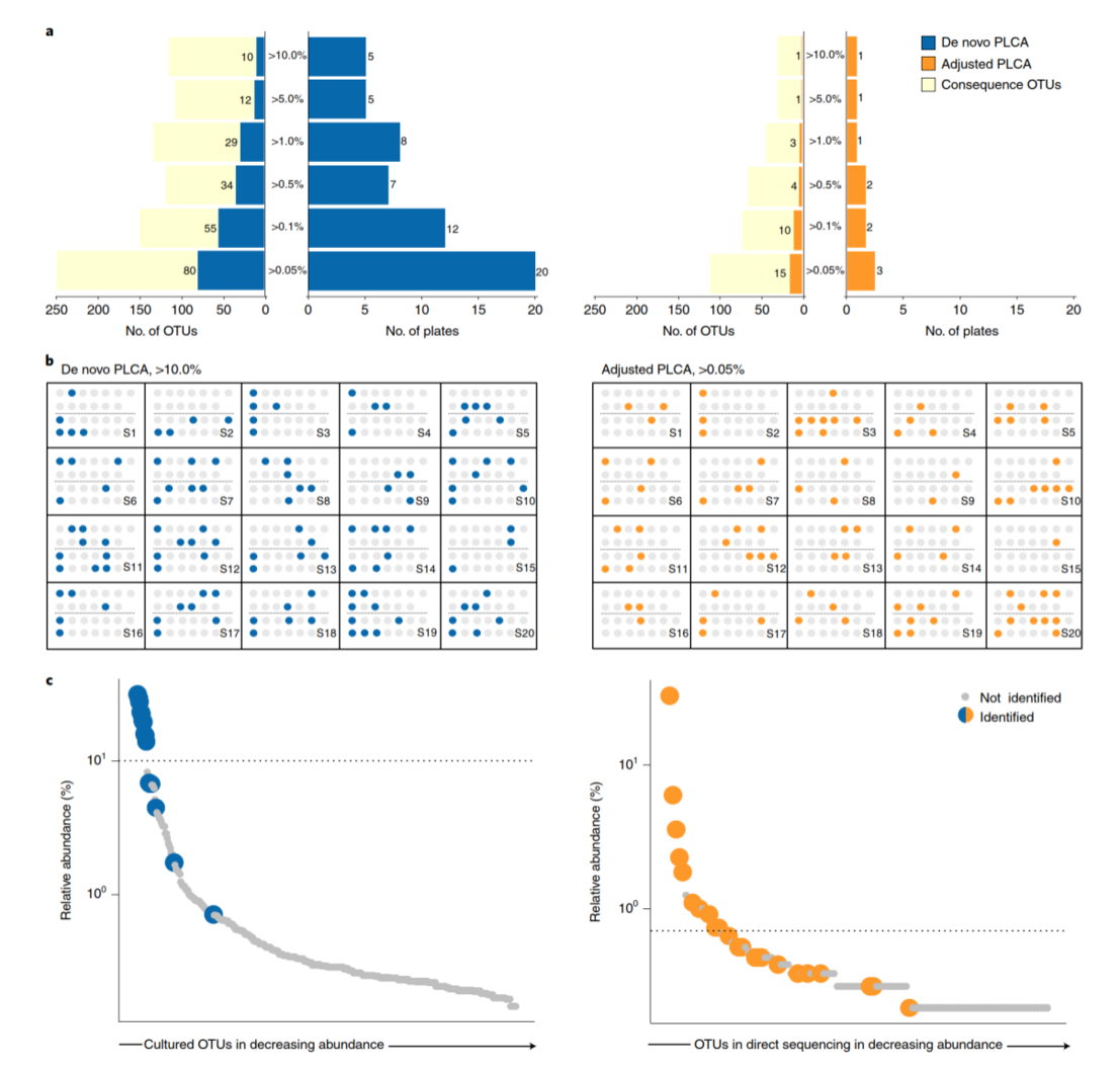作者采用了PLCA算法,來(lái)決定需要進(jìn)行富集培養(yǎng)宏基因組測(cè)序的最小樣品數(shù),算法對(duì)任何含有大部分可培養(yǎng)富集的菌群生態(tài)均適用。PLCA算法有兩個(gè)版本,從頭 PLCA不依賴(lài)于直接測(cè)序結(jié)果再現(xiàn)富集培養(yǎng)菌群,而校正PLCA側(cè)重于直接測(cè)序結(jié)果中OTU的修復(fù),這取決于是否都對(duì)原始樣品的菌群組成感興趣。采用這兩種算法,數(shù)據(jù)集凸顯了不同樣本的獨(dú)特性:從頭PLCA顯示,每個(gè)樣本具有獨(dú)特的平板集,并且每個(gè)培養(yǎng)條件對(duì)每個(gè)樣本都是必要的;校正PLCA顯示對(duì)數(shù)據(jù)集中樣本進(jìn)行富集培養(yǎng)宏基因組測(cè)序是很有必要的(圖4a,b)。
