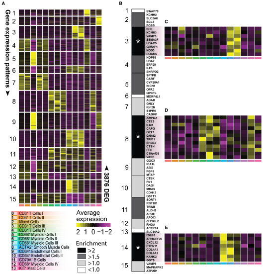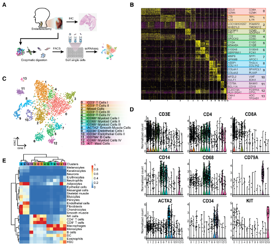 我們觀察到3個非免疫細胞簇(簇8,9和10;表達CD34和ACTA2[肌動蛋白α2,平滑肌])和11個白細胞簇(圖1B和1D)。后者包括5個淋巴細胞簇(第0、1、3、4、11簇;表達CD3E、CD4、CD8、CD79A),5個髓系簇(第5、6、7、12和13簇;表達CD14、CD68、KIT),和1個沒有明確的細胞類型表達譜的混合細胞的簇(第2簇),但與其他簇有相似的基因表達,似乎主要含有凋亡的髓系細胞和T細胞(圖1B和1D)。T細胞是我們數(shù)據(jù)集中豐富的群體,占所有分析細胞的52.4%,而髓系群體占所有細胞的18.5%。