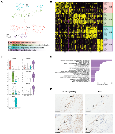 EC簇之間的聚集以及SMC相關(guān)通路的富集(圖2D),表明這個亞群可能正在經(jīng)歷內(nèi)皮細胞向間充質(zhì)細胞的轉(zhuǎn)變,或者反之亦然。為了驗證這些發(fā)現(xiàn),我們觀察了ACTA2和CD34在連續(xù)的組織學(xué)切片上的表達(圖2E)。