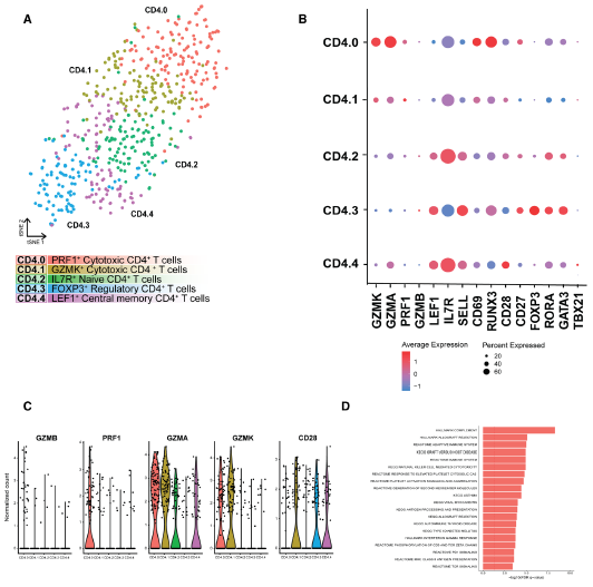 為了更詳細地定義T細胞,我們分離和重新聚類CD4+T細胞,發(fā)現(xiàn)了5個亞類(CD4.0-CD4.4,圖3A),其中主要的區(qū)別是它們的激活狀態(tài),而不是通常用于定義CD4+T輔助亞群的轉(zhuǎn)錄因子和細胞因子(圖3B和3C)。CD4.0和CD4.1具有細胞毒基因表達譜,此外,這一簇中的基因表達證實了與適應(yīng)性免疫反應(yīng)相關(guān)的促炎通路的富集(圖3D)。