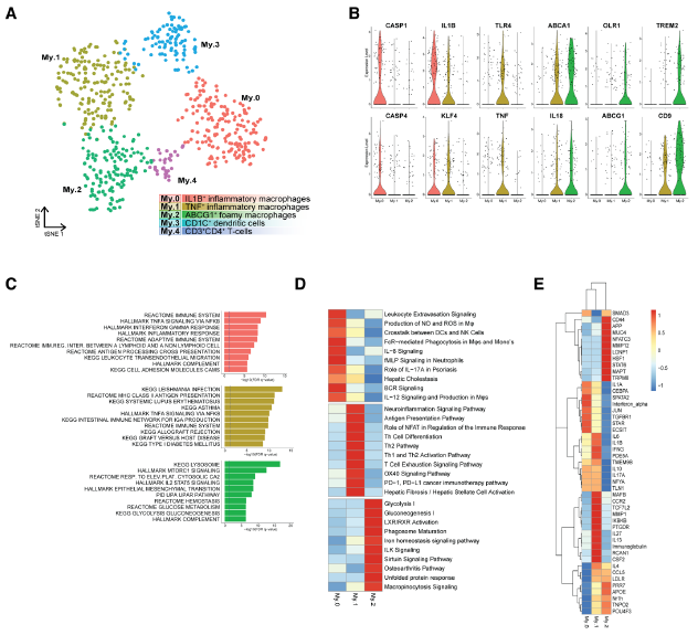 我們分離和重新聚類動脈粥樣硬化性髓系細胞,揭示了5種不同的表型(My.0-My.4,圖4A)。My.0、My.1和My.2很可能代表不同激活狀態(tài)的巨噬細胞。促炎標志物基因(圖4B)以及免疫和炎癥通路的富集結(jié)果(圖4C)表明,My.0和My.1亞類由促炎巨噬細胞組成。My.0顯示了最近招募的巨噬細胞的特征(圖4C,D),表明共表達的炎癥體被激活(圖4B)。與My.0和My.1相比,My.2缺乏明顯的促炎標志物,并顯示巨噬細胞和泡沫細胞的跡象。