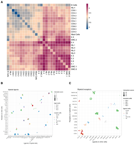 隨后,我們按髓系配體(圖5B)和受體(圖5C)明確地檢查了髓系群體中獨特的相互作用。發(fā)現(xiàn)了多種趨化作用,包括內(nèi)皮ACKR1與髓系來源的CCL2、CXCL8、CCL8和CXCL1的相互作用,其中最后兩個配體在My.1中特異性表達。我們還觀察到在所有髓系亞群中的CSF1R,與在內(nèi)皮細胞、平滑肌細胞、肥大細胞和髓系細胞中的CSF1有相互作用。