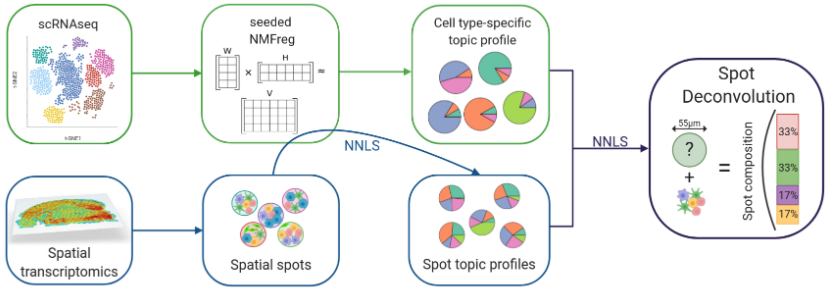 ?現在10x Visium數據基礎的分析思路是將每個spot看作一個細胞,然后參考單細胞轉錄組的分析思路進行分析。但是現在的實驗中,單個spot中包含不僅是一個細胞。如何確定每個spot中包含的細胞,對于空間轉錄組的分析是有幫助的。SPOTlight可以結合單細胞RNA測序信息反卷積空間數據,識別每個spot中的細胞類型和比例。