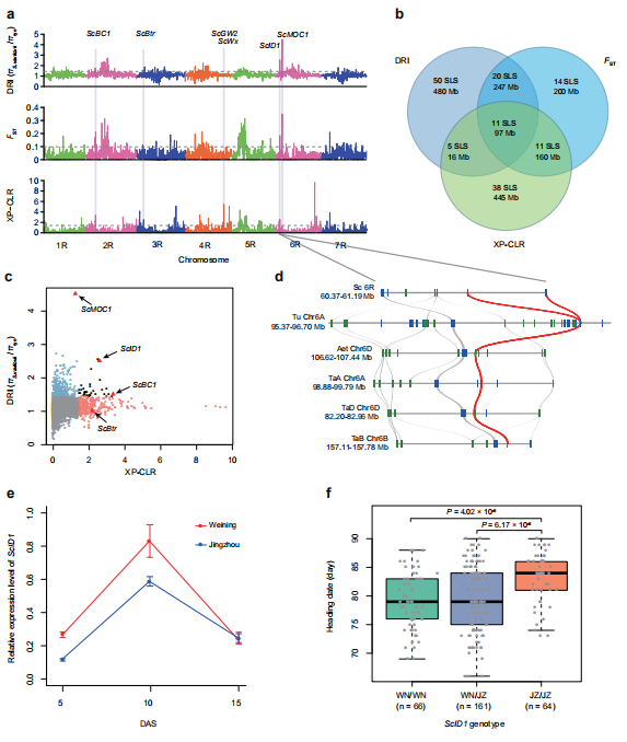 對(duì)馴化基因的分析可以促進(jìn)對(duì)作物性狀的理解和改良,但在黑麥中這類基因的分子分析方面進(jìn)展甚微。作者通過全基因組選擇清除分析,利用在栽培黑麥和瓦維洛夫黑麥(S. vavilovii)之間鑒定的123647個(gè)SNPs,挖掘黑麥馴化相關(guān)染色體區(qū)域和基因座。DRI、FST、XP-CLR分析中,共同識(shí)別到11個(gè)選擇信號(hào)(圖7a-c)。通過與水稻和大麥的共線性比較,發(fā)現(xiàn)了一些可能的選擇清除位點(diǎn),包括已在水稻或大麥中已被功能分析的ScBC1、ScBtr、ScGW2、ScMOC1ScID1ScWx的同源基因(圖7a-c)。