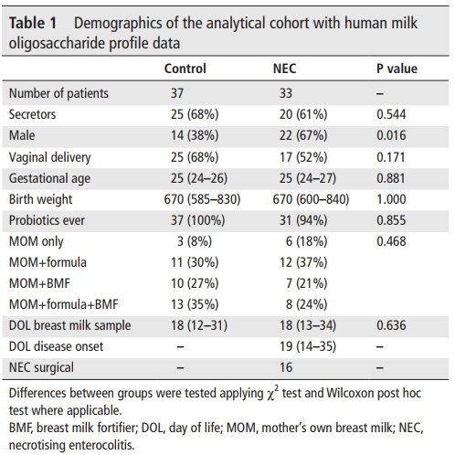 目的:壞死性小腸結(jié)腸炎(NEC)是一種影響早產(chǎn)兒的嚴(yán)重腸道疾病。人們對(duì)其潛在機(jī)制知之甚少:母親自己的母乳(MOM)具有保護(hù)性,可能與母乳寡糖(HMO)和嬰兒腸道微生物相互作用。作者研究了HMO和嬰兒腸道微生物組發(fā)育之間的相互作用及其與NEC之間的關(guān)系。設(shè)計(jì):作者對(duì)33例NEC患兒和37例對(duì)照母乳中的母乳寡糖進(jìn)行了分析。對(duì)48名嬰兒(含14例NEC患兒)糞便進(jìn)行了縱向宏基因組測(cè)序(n=644)。