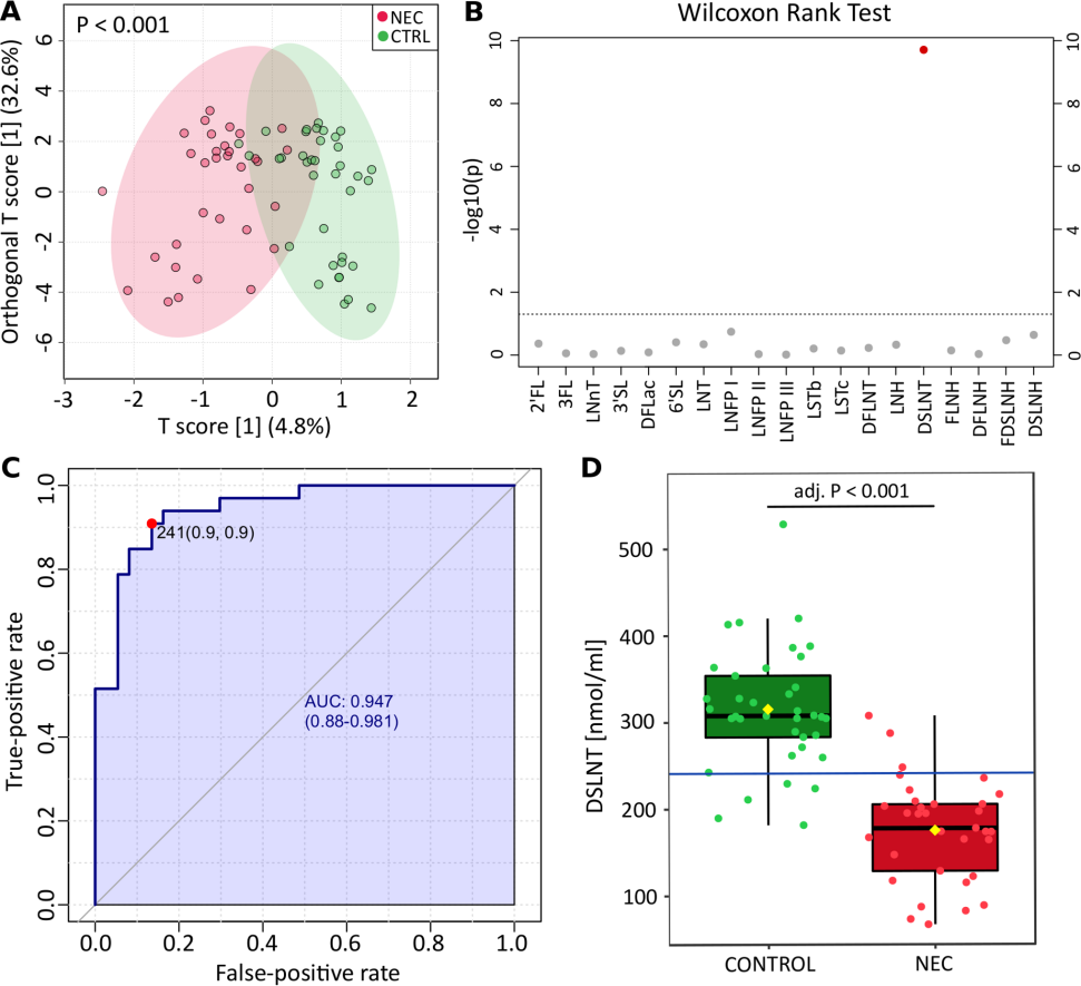 考慮到較低的DSLNT與NEC相關(guān)而不受分泌狀態(tài)的影響,作者探討了HMO作為NEC發(fā)育的生物標(biāo)志物的用途。單因素ROC曲線分析表明,241nmol/ml是MOM中DSLNT鑒別NEC和對(duì)照嬰兒的最佳濃度(圖1C和D)。AUC值為0.947,靈敏度為0.9,特異性為0.9。