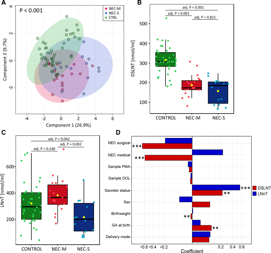 作者隨后通過(guò)調(diào)整線性模型研究了DSLNT和LNnT濃度與臨床變量之間的潛在關(guān)聯(lián)。DSLNT與兩種疾病類型呈負(fù)相關(guān),NEC-M的系數(shù)值為-0.60,NEC-S的系數(shù)值為-0.67(圖2D)。然而根據(jù)調(diào)整后的線性模型LNnT與疾病類型無(wú)關(guān)。分泌型母親中DSLNT和LNnT均顯著較高。母親的DSLNT與胎齡呈正相關(guān),與出生體重呈負(fù)相關(guān)。HMO與母親性別、分娩方式、胎齡和DOL均無(wú)相關(guān)性(圖2D)。