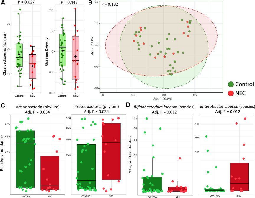 作者納入了含有HMO數(shù)據(jù)的嬰兒的糞便微生物組數(shù)據(jù),進(jìn)行獨(dú)立研究獲得宏基因組測(cè)序數(shù)據(jù)。14例NEC患兒和34例對(duì)照組的644個(gè)糞便樣本。NEC患兒物種豐富度顯著降低,shannon指數(shù)差異不顯著(圖3A)。PCoA分析顯示NEC和對(duì)照之間細(xì)菌菌群結(jié)構(gòu)差異不大(圖3B)。門水平分析顯示,相比于對(duì)照組NEC患兒Actinobacteria 相對(duì)豐度顯著降低,Proteobacteria 相對(duì)豐度顯著升高(圖3C)。種水平分析相比于對(duì)照組NEC患兒B. longum相對(duì)豐度降低,Enterobacter cloacae相對(duì)豐度升高(圖3D)。