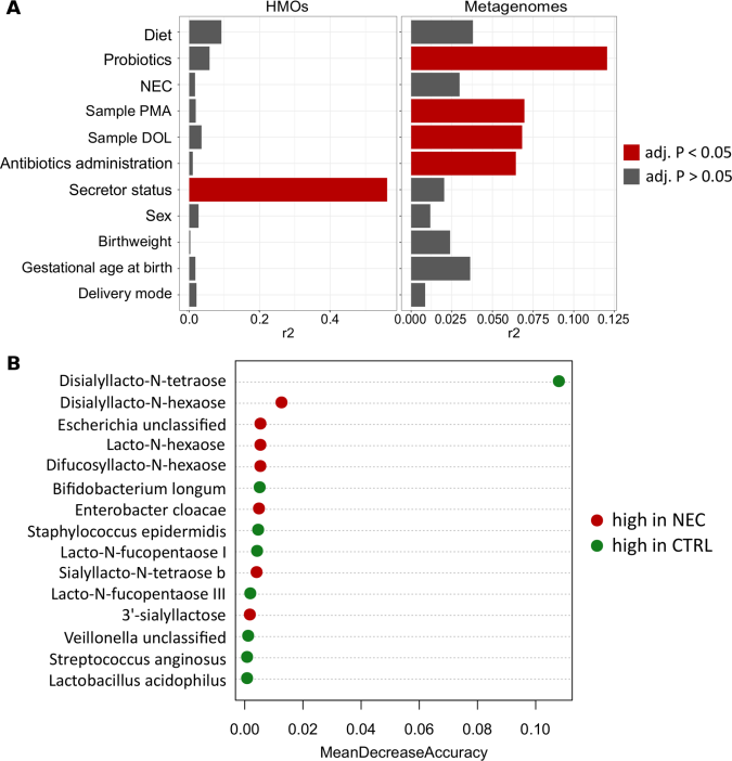 使用橫斷面HMO和橫斷面宏基因組數(shù)據(jù)集,作者試圖確定哪些臨床因素與HMO和細(xì)菌圖譜最相關(guān)(圖5A)。分泌狀態(tài)可以解釋HMO 56%的變異,其他協(xié)變量與HMO無(wú)顯著相關(guān)性。細(xì)菌圖譜與胎齡、DOL、抗生素使用和益生菌服用顯著相關(guān),而與母親的分泌狀態(tài)相關(guān)性不顯著。總之這些發(fā)現(xiàn)強(qiáng)調(diào)了HMO和細(xì)菌分布受多種非重疊因素影響。