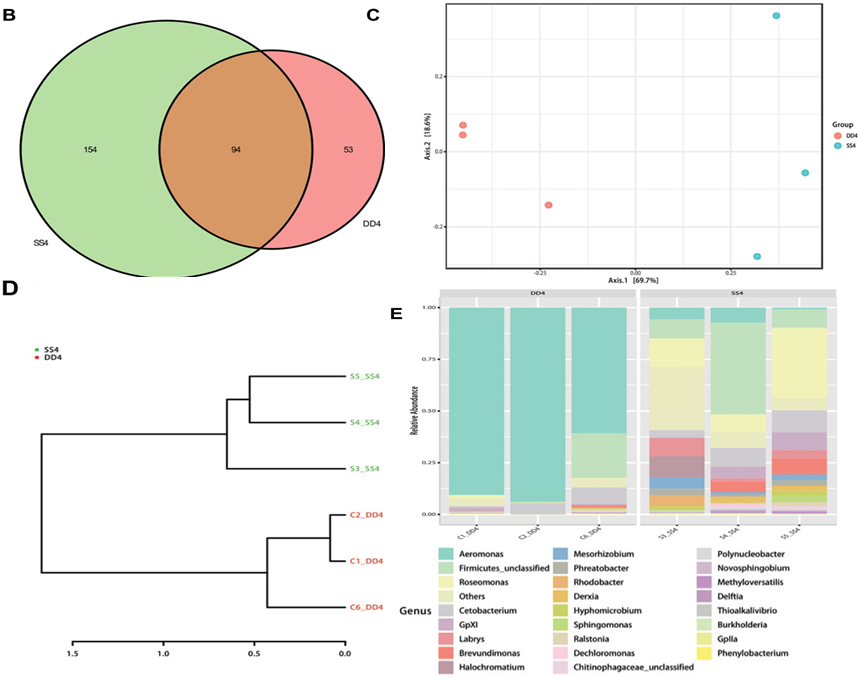 測序樣品:養(yǎng)殖5個月后,隨機(jī)各抽取3條魚(饑餓24小時),將腸分為前腸、中腸和后腸段,并用鑷子擠壓將每個片段的內(nèi)容物收集到無菌的2ml收集管中(DD4指對照組樣本,SS4指實(shí)驗(yàn)組樣本)。對應(yīng)的同一樣本腸道組織用于轉(zhuǎn)錄組測序(CT指對照組樣本,ST指實(shí)驗(yàn)組樣本)。