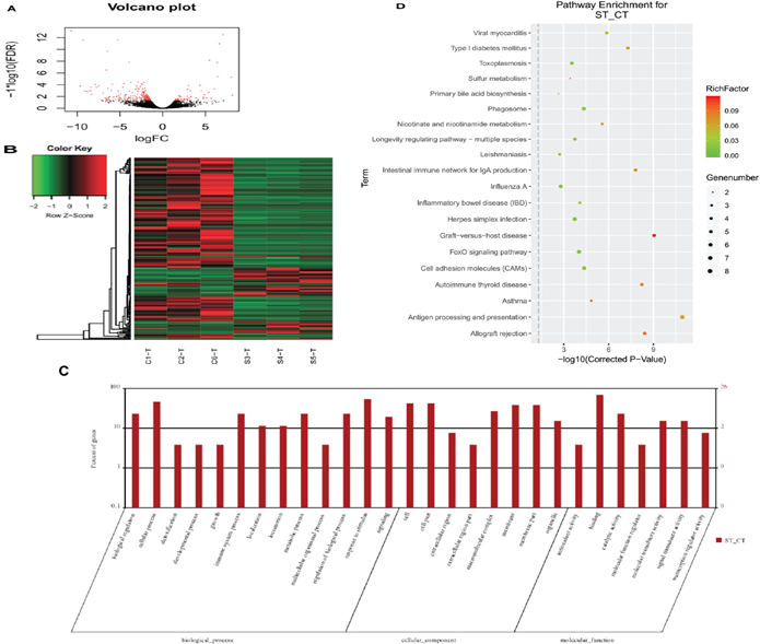 使用與16S測序相同的樣本對黃河鯉新品種(實(shí)驗(yàn)組)和對照組中的轉(zhuǎn)錄組進(jìn)行測序并鑒定差異基因(DEG)。在249個顯著DEGs中(如圖3A),194個基因表達(dá)下調(diào),55個基因表達(dá)上調(diào)。通過GO注釋,這些基因被分為以下功能類別:生物調(diào)節(jié)、細(xì)胞過程、解毒作用、發(fā)育過程、免疫系統(tǒng)進(jìn)程等(都屬于生物過程);細(xì)胞、細(xì)胞部分、胞外區(qū)域、胞外區(qū)域部分、大分子復(fù)合物等(細(xì)胞成分);抗氧化活性、結(jié)合活性、催化活性、分子功能調(diào)節(jié)器上等(分子功能)。聚類分析表明,實(shí)驗(yàn)組和對照組具有不同的特征,DEG分為四個部分(圖3B)。這些基因的GO注釋包括生物學(xué)過程中的13個類別,細(xì)胞成分中的8類和分子功能類別中的7類(圖3C)。KEGG注釋將這些基因中的大部分分配到免疫相關(guān)途徑(圖3D)。