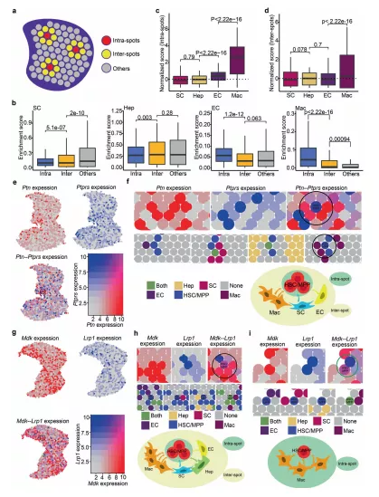 a點(diǎn)內(nèi)、點(diǎn)間及其他的示意圖。點(diǎn)內(nèi):HSC/MPP 定位點(diǎn);點(diǎn)間:HSC/MPP 包圍點(diǎn);其他,其他遠(yuǎn)端的點(diǎn)。b箱線圖展示點(diǎn)內(nèi)、點(diǎn)間和其他點(diǎn)中生態(tài)位細(xì)胞的富集分?jǐn)?shù)。c箱線圖展示了點(diǎn)內(nèi)生態(tài)位細(xì)胞的歸一化(富集)評(píng)分。d箱線圖顯示點(diǎn)間生態(tài)位細(xì)胞的歸一化(富集)評(píng)分。e FL中Ptn和Ptprs 的共表達(dá)模式。f 空間特征圖展示Ptn-Ptprs豐富的 HSC/MPP 擴(kuò)增單元?;騊tn在生態(tài)位細(xì)胞定位點(diǎn)(頂部,紅色點(diǎn))和基因Ptprs在HSC/MPP 定位點(diǎn)(頂部,藍(lán)色點(diǎn))的表達(dá)模式。g FL中Mdk和Lrp1 的共表達(dá)模式。h富含Mdk -Lrp1 的HSC/MPP 擴(kuò)增單元(點(diǎn)間)的空間特征圖。i空間特征圖展示富含Mdk- Lrp1 的HSC/MPP 擴(kuò)增單元(點(diǎn)內(nèi))。