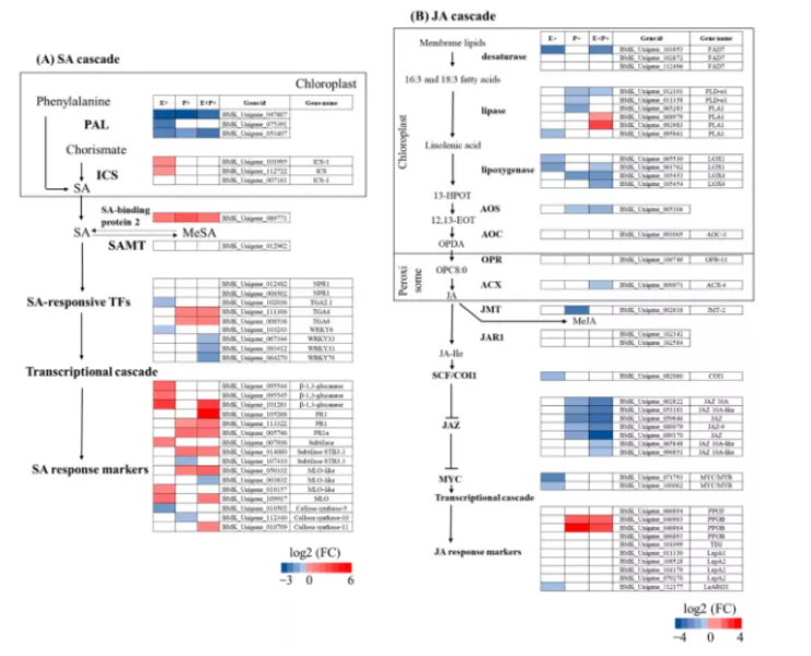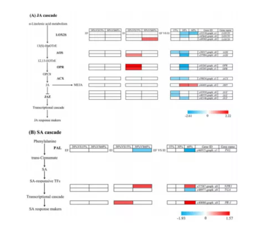分析不同處理下,與JA和SA生物合成和反應途徑相關的DEGs。發(fā)現(xiàn)了12個參與α-亞麻酸代謝和JA介導的信號通路的基因和4個參與苯丙氨酸和SA介導的信號通路的基因。JA和SA生物合成和反應途徑的關鍵基因,如LOX2S、AOS、OPR、ACX、JMT、JAZ、PAL、NPR1、TGA和PR-1,表現(xiàn)出不同程度的上調(diào)或下調(diào)。
