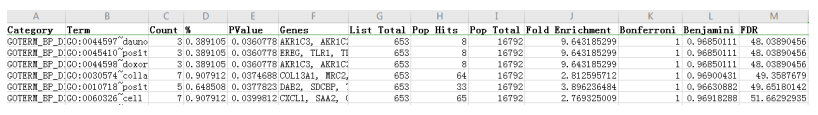DAVID是一款免費(fèi)的在線分析軟件,我們只需要準(zhǔn)備一列基因名(gene list)。下載其結(jié)果,如下圖所示: