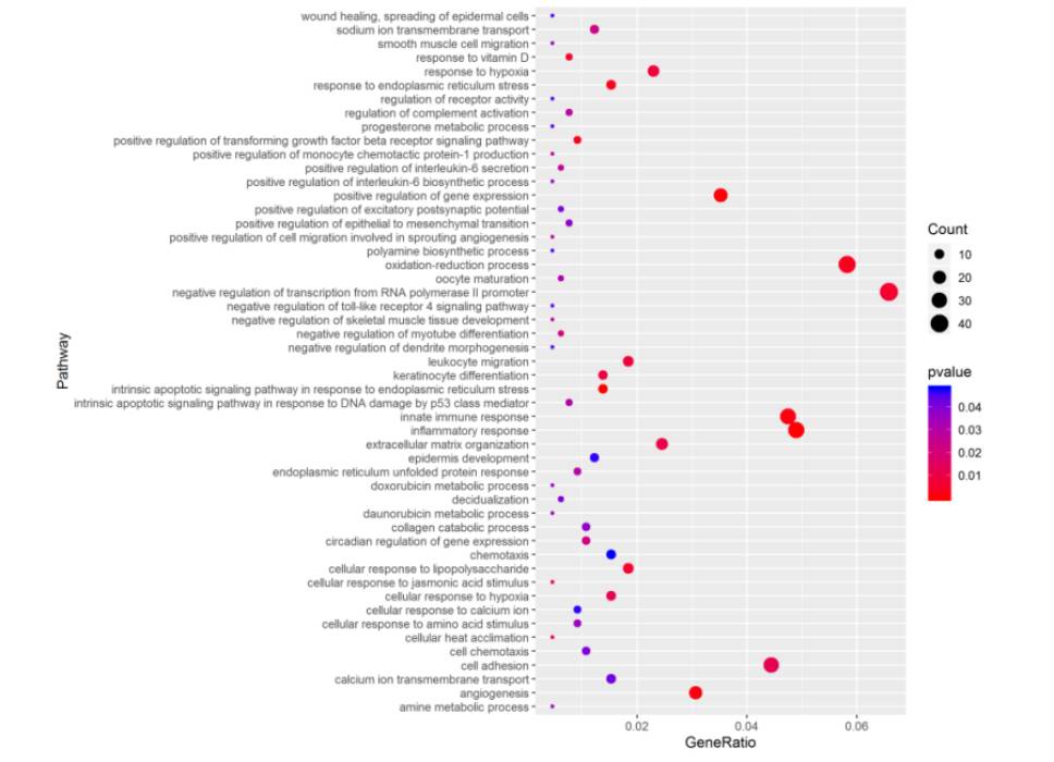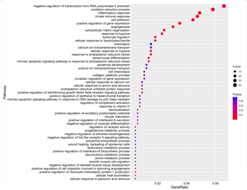 p=p + geom_point()+theme(axis.text.x = element_text(colour=”black”,size=1))p=p + geom_point(aes(size=Count))pbubble = p+ geom_point(aes(color=Pvalue,size=Count))pr = pbubble+scale_color_gradient(low=”red”,high = “blue”)