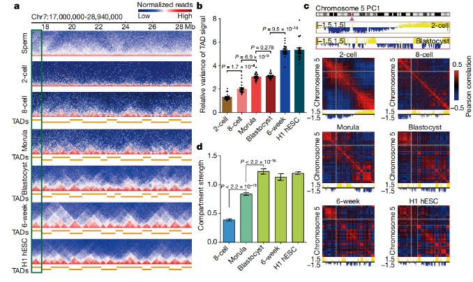 總之,這些數(shù)據表明,TAD結構在人的2細胞胚胎中基本上不存在,在8細胞胚胎中很少存在,并且在胚胎發(fā)育過程中變得越來越明顯。
