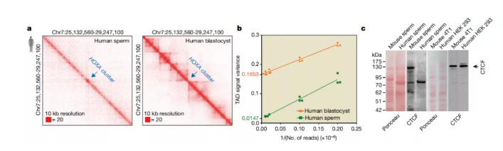 圖a 人類精子,人類胚胎和H1人類ES細胞(hESCs)中高階染色質結構相互作用熱圖,分辨率為40 kb(合并的生物學重復;n = 2-3)。