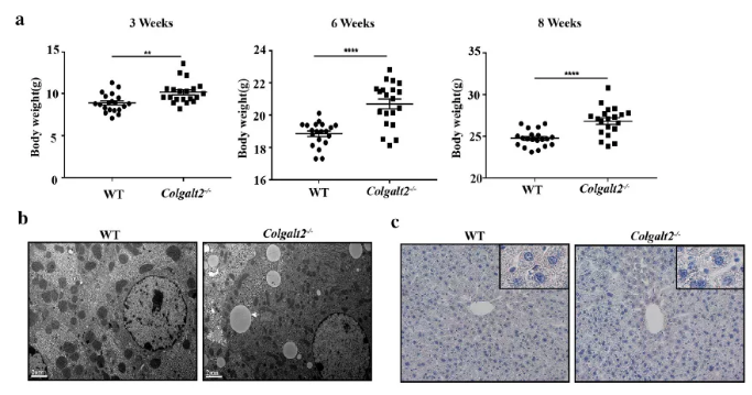 通過肝組織的PCR和western blotting,結(jié)果顯示Colgalt2?/?小鼠中不表達(dá)COLGALT2。在3,6,8周齡時分別對Colgalt2?/?和WT小鼠稱重,結(jié)果顯示Colgalt2敲除增加了小鼠的體重(圖1a)。通過透射電鏡觀察發(fā)現(xiàn),6周齡Colgalt2?/?小鼠肝細(xì)胞中有脂滴聚集(圖1b)。然而,在6-8 周齡時,WT小鼠和Colgalt2?/?小鼠的肝油紅O染色和TG含量沒有明顯差異(圖1c)。
