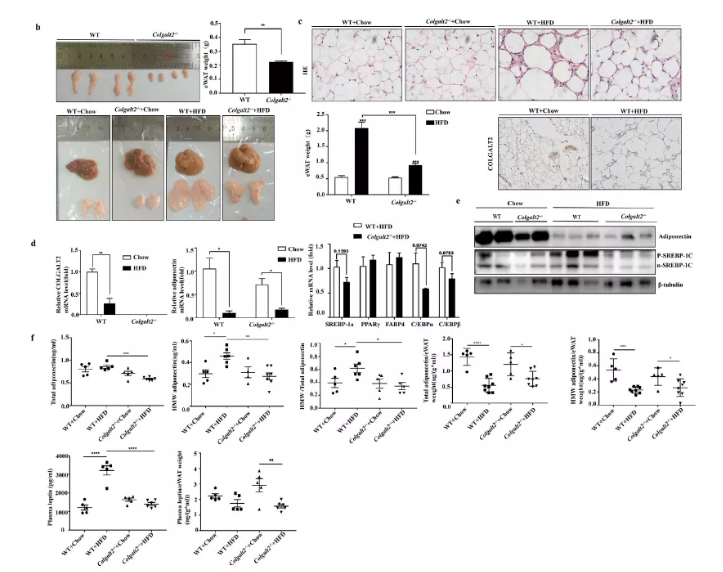 脂聯(lián)素對肝細(xì)胞有重要的抗脂肪變性作用。因此,為了檢測Colgalt2對脂聯(lián)素的影響,作者研究了脂聯(lián)素在白色脂肪組織WAT中的表達(dá)、血漿總脂聯(lián)素和HMW脂聯(lián)素水平。出人意料的是,在Colgalt2缺陷的小鼠中觀察到部分脂肪營養(yǎng)不良。與WT小鼠相比,Colgalt2?/?小鼠(6周齡)的eWAT體重降低(圖4b)。此外,在HFD喂養(yǎng)16周后,Colgalt2敲除抑制小鼠的脂肪組織擴張,而在WT小鼠脂肪組織明顯體積增大(圖4b)。脂肪形成由復(fù)雜的轉(zhuǎn)錄因子網(wǎng)絡(luò)(C/EBP家族成員,PPARγ,SREBP-1c等) 控制,這些因子在脂聯(lián)素基因表達(dá)、代謝和其他脂肪特異性基因中發(fā)揮重要作用。在HFD喂養(yǎng)的Colgalt2?/?小鼠中,C/EBPα、C/EBPβ和脂肪生成標(biāo)記物SREBP1a有降低趨勢(圖4d)。此外,在HFD喂養(yǎng)的Colgalt2?/?小鼠中,p-SREBP-1c和n-SREBP- 1c蛋白表達(dá)明顯下調(diào)(圖4e)。