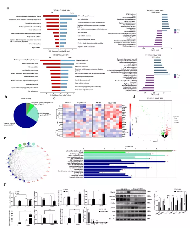 為了探索NAFLD中Colgalt2缺乏的潛在機制,作者對WT小鼠和飼喂HFD或標(biāo)準(zhǔn)飼料的Colgalt2?/?小鼠肝組織進行ONT全長轉(zhuǎn)錄組測序。結(jié)果顯示,與WT小鼠相比,HFD喂養(yǎng)的Colgalt2?/?小鼠中有321個DEGs。為了明確DEGs的功能,分別對上調(diào)和下調(diào)的 DEGs進行KEGG通路富集分析(P < 0.05) (圖5a)。對于上調(diào)的基因,KEGG分析顯示這些差異表達(dá)基因顯著富集于MAPK信號通路、NAFLD、和氧化磷酸化。下調(diào)的基因富集于脂肪消化和吸收、甘油脂代謝。在這些途徑中,19個差異表達(dá)基因與脂代謝密切相關(guān),包括adipoR1、adipoR2和脂質(zhì)合成相關(guān)的分子,包括Cidea和Cidec (FSP27)、Cd36和PPARγ(圖5c)。為了進一步研究這19個基因在這些通路中的作用,使用ClueGO和CluePedia工具解讀這些通路網(wǎng)絡(luò)(圖5 d)。這些基因在AMPK信號通路、脂肪細(xì)胞因子信號通路和NAFLD等中富集(圖5 b和e)。