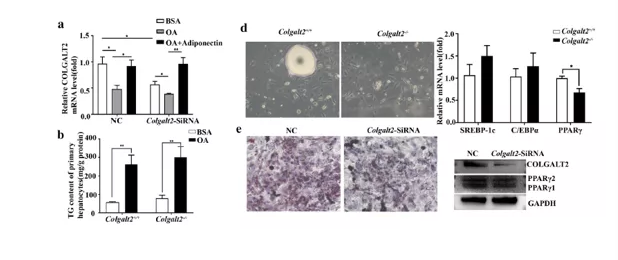 為了探究COLGALT2缺乏在脂肪萎縮中的作用, 在3T3-L1細(xì)胞中誘導(dǎo)了前脂肪細(xì)胞分化,從Colgalt2?/?和WT小鼠的eWAT中分離原代前脂肪細(xì)胞(圖6d)。油紅 O染色結(jié)果顯示干擾Colgalt2降低了前脂肪細(xì)胞分化為脂肪細(xì)胞(圖6e)。此外,干擾Colgalt2下調(diào)了脂肪前細(xì)胞向脂肪細(xì)胞分化過程中PPARγ的表達(dá)(圖6e)。此外,從Colgalt2?/?和WT小鼠的eWAT中分離出原代前脂肪細(xì)胞,結(jié)果顯示,Colgalt2敲除降低了PPARγ mRNA水平(圖6d)。然而,來自Colgalt2?/?和WT小鼠的原代前脂肪細(xì)胞分化后,C/EBPα、C/EBPβ或SREBP-1c mRNA水平無顯著差異。
