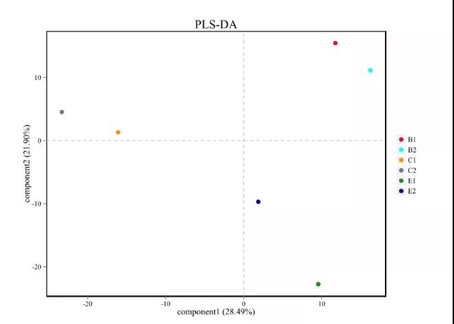 偏最小二乘判別分析(Partialleast squares discriminant analysis,PLS-DA)是多變量數(shù)據(jù)分析技術(shù)中的判別分析法,經(jīng)常用來(lái)處理分類(lèi)和判別問(wèn)題。通過(guò)對(duì)主成分適當(dāng)?shù)男D(zhuǎn),PLS-DA可以有效的對(duì)組間觀察值進(jìn)行區(qū)分,并且能夠找到導(dǎo)致組間區(qū)別的影響變量。PLS-DA采用了經(jīng)典的偏最小二乘回歸模型,其響應(yīng)變量是一組反應(yīng)統(tǒng)計(jì)單元間類(lèi)別關(guān)系的分類(lèi)信息,是一種有監(jiān)督的判別分析方法。因無(wú)監(jiān)督的分析方法(PCA)對(duì)所有樣本不加以區(qū)分,即每個(gè)樣本對(duì)模型有著同樣的貢獻(xiàn),因此,當(dāng)樣本的組間差異較大,而組內(nèi)差異較小時(shí),無(wú)監(jiān)督分析方法可以明顯區(qū)分組間差異;而當(dāng)樣本的組間差異不明晰,而組內(nèi)差異較大時(shí),無(wú)監(jiān)督分析方法難以發(fā)現(xiàn)和區(qū)分組間差異。另外,如果組間的差異較小,各組的樣本量相差較大,樣本量大的那組將會(huì)主導(dǎo)模型。有監(jiān)督的分析(PLS-DA)能夠很好的解決無(wú)監(jiān)督分析中遇到的這些問(wèn)題。
