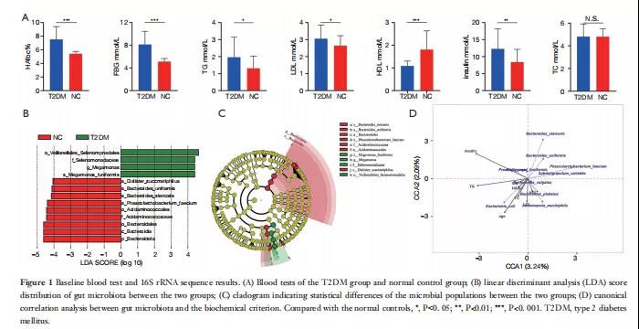 從測(cè)序的60個(gè)樣本中,共獲得514080個(gè)CCS序列。每個(gè)樣本產(chǎn)生至少428個(gè)CCS序列,平均8568個(gè)CCS序列。兩組的OTU數(shù)量、chao和ACE指數(shù)在統(tǒng)計(jì)學(xué)上存在顯著差異(分別為P=0.01、0.007和0.037),這表明T2DM可能引起腸道微生物多樣性的變化。Shannon和Simpson指數(shù)分析表明,測(cè)序深度足以捕獲所有細(xì)菌物種,樣本具有代表性。通過(guò)分析α多樣性和β多樣性,初步解釋了兩組間差異的構(gòu)成。在門(mén)水平上,厚壁菌、類(lèi)桿菌、變形菌和放線菌是這兩組腸道微生物群的優(yōu)勢(shì)種,且比例相對(duì)較高。在正常對(duì)照組中,厚壁菌、類(lèi)桿菌和變形菌分別占腸道微生物群的40.5%、45.1%和18.7%,而在T2DM組中,分別占47.4%、25.8%和21.4%。在T2DM組,類(lèi)桿菌作為優(yōu)勢(shì)菌群的差異具有統(tǒng)計(jì)學(xué)意義(P=0.0049),類(lèi)桿菌與厚壁菌的比例降低。LEfSe分析確定了兩組之間53種顯著不同的物種(生物標(biāo)記物篩選標(biāo)準(zhǔn):LDA評(píng)分>4,P<0.05)(圖1B,C)。不同腸道微生物群水平與基本指標(biāo)之間相關(guān)性的CCA典型相關(guān)分析結(jié)果如圖1D所示。