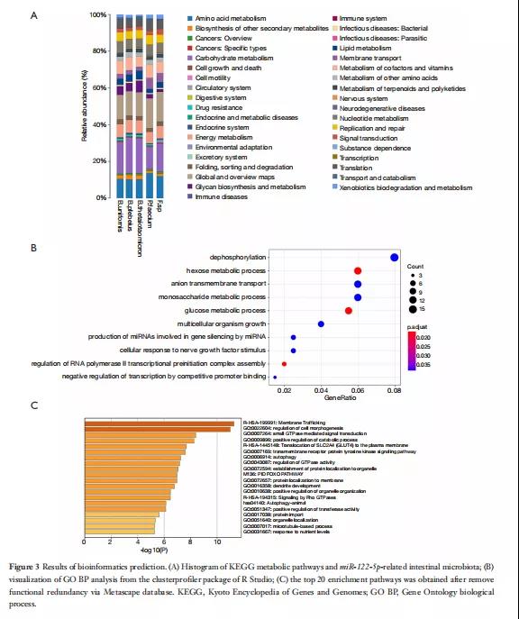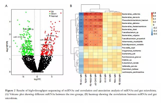 通過(guò)行Spearman相關(guān)分析。圖2B顯示了一個(gè)熱圖,描繪了五個(gè)與某些微生物區(qū)系具有統(tǒng)計(jì)顯著正相關(guān)和負(fù)相關(guān)的miRNA(P<0.05)。在這五種miRNA中,miR-122-5p在哺乳動(dòng)物的進(jìn)化過(guò)程中高度保守,與八種腸道細(xì)菌相關(guān),包括兩種腸道細(xì)菌B.uniformis和P.faecium,它們有顯著差異(分別為P=0.023和0.031)。