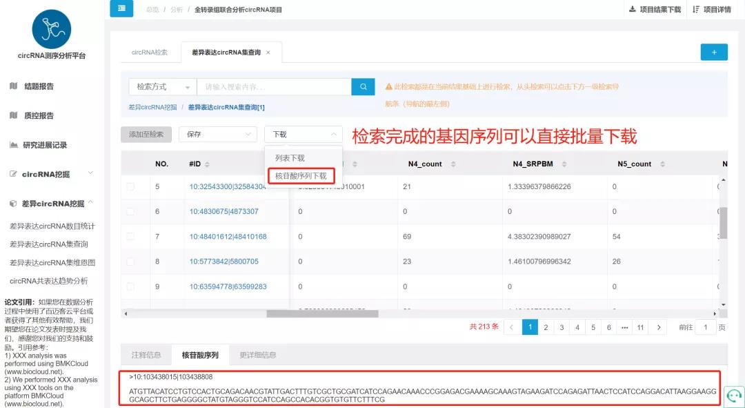CircRNA的功能分析主要依靠于來源基因的功能注釋,如何在海量的數(shù)據(jù)中直接找到關(guān)心的目的基因呢?首先就是根據(jù)功能注釋進(jìn)行檢索,百邁客云平臺(tái)的CircRNA分析平臺(tái)中,支持針對(duì)結(jié)果根據(jù)八大功能數(shù)據(jù)庫(kù)的注釋信息批量檢索相關(guān)注釋基因、并且批量提取相關(guān)信息;靶向關(guān)系的預(yù)測(cè)也是關(guān)鍵circRNA檢索的必要一步,CircRNA分析平臺(tái)同時(shí)支持通過miRNA的ID批量提取相關(guān)靶向的CircRNA信息,此外,CircRNA ID、來源基因ID、來源基因name等功能,通過上傳ID文件均可實(shí)現(xiàn)批量查詢,甚至可以批量下載序列文件,省去多個(gè)文件來回切換的繁雜操作,一鍵式提取關(guān)鍵信息!