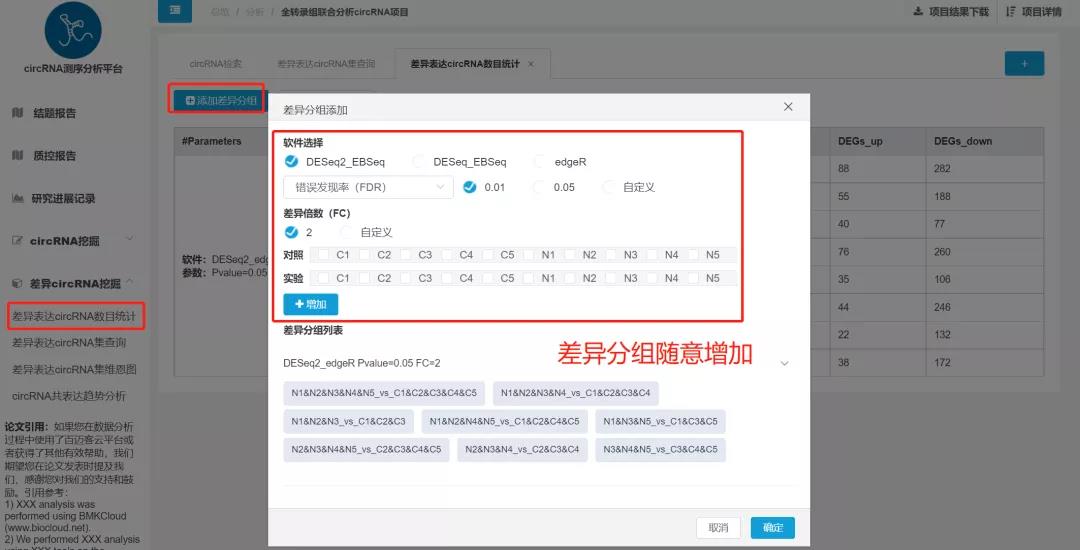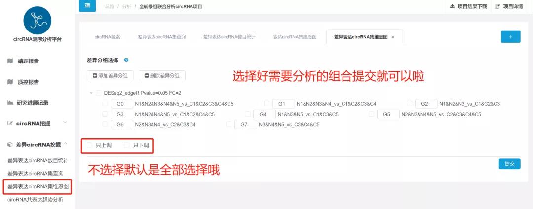 對(duì)于需要通過結(jié)果分析挑選關(guān)鍵基因的研究方向來說,選擇合適的差異篩選條件對(duì)于基因的選擇是事半功倍的,但是往往合適的篩選條件需要多次的調(diào)整摸索,這時(shí)差異篩選條件的調(diào)整功能顯得尤為重要,CircRNA云平臺(tái)同樣支持在線完成差異參數(shù)的調(diào)整,基因數(shù)目太少、差異軟件不合適、參數(shù)設(shè)置不合理等問題,通通可以調(diào)整!不限次、不限時(shí),只需簡(jiǎn)單的點(diǎn)擊,輕松完成!