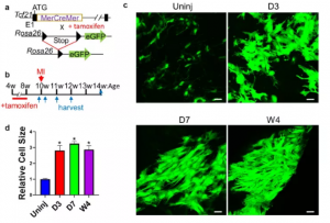 本文采用他莫昔芬對小鼠進行處理,并手術(shù)誘導(dǎo)心肌梗死(MI)(圖 1a,b)。未受傷心肌和梗死區(qū)的共聚焦成像顯示MI后心臟成纖維細胞數(shù)量顯著增加,心臟成纖維細胞也變大了(圖1c,d))。